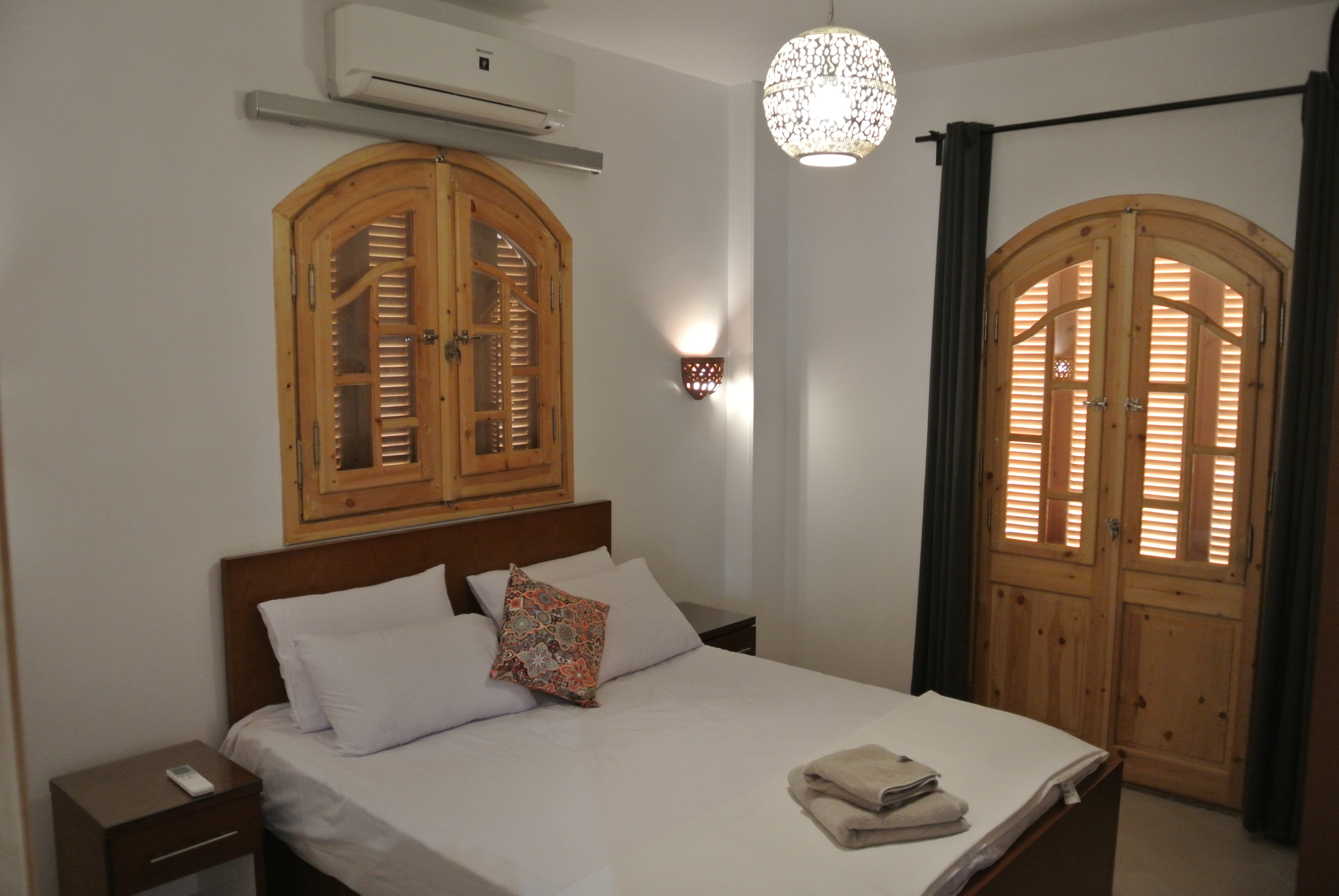 Luxurious one bedroom apartment has been tastefully decorated with large Kingsize bed with patio doors leading to a private balcony over looking Dahab and the glorious sunsets over the magical red mountains. It possesses a large modern fully fitted kitchen, with electric oven and gas hob and large fridge freezer, and granite worktops, it also has the added bonus of including an automatic washing machine. It has it’s own WiFi and 42 inch TV and a comfortable sofa. Large shower room Ideal Standard and Grohe shower and taps and has been tastefully tiled. There is access to the large roof terrace via a spiral staircase with sun lounges and sea and mountain views.